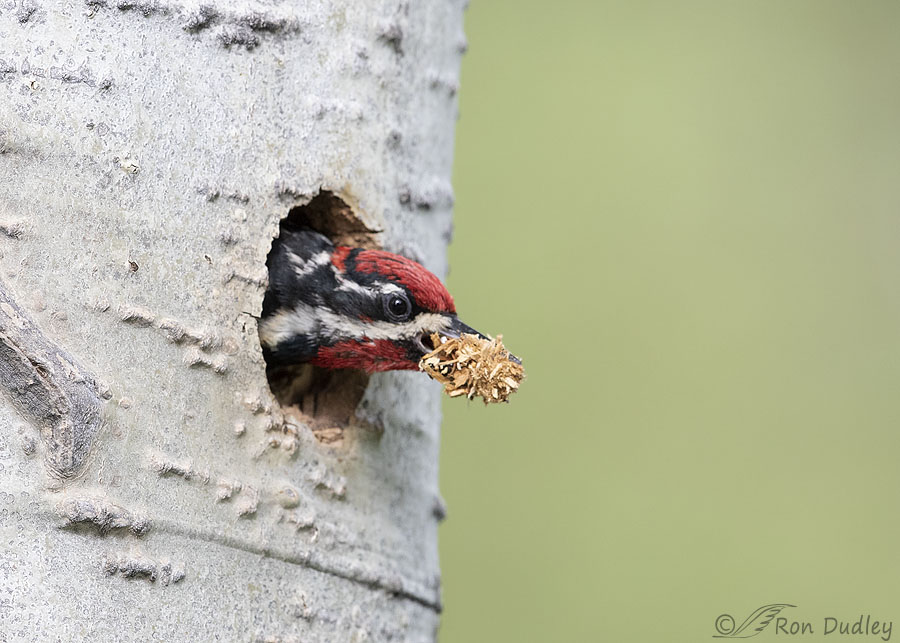 Chips are removed from the cavity for two reasons – they’re often sodden with chick wastes so they have to be removed for sanitary reasons and the adults are constantly chipping away at the interior of the cavity to make it large enough to accommodate the growing chicks. When I’m photographing sapsuckers at their nest cavity I can often hear them pounding away inside where I can’t see them. When I hear the pounding stop I know it’s time to get ready with my camera for one of their explosive exits.
