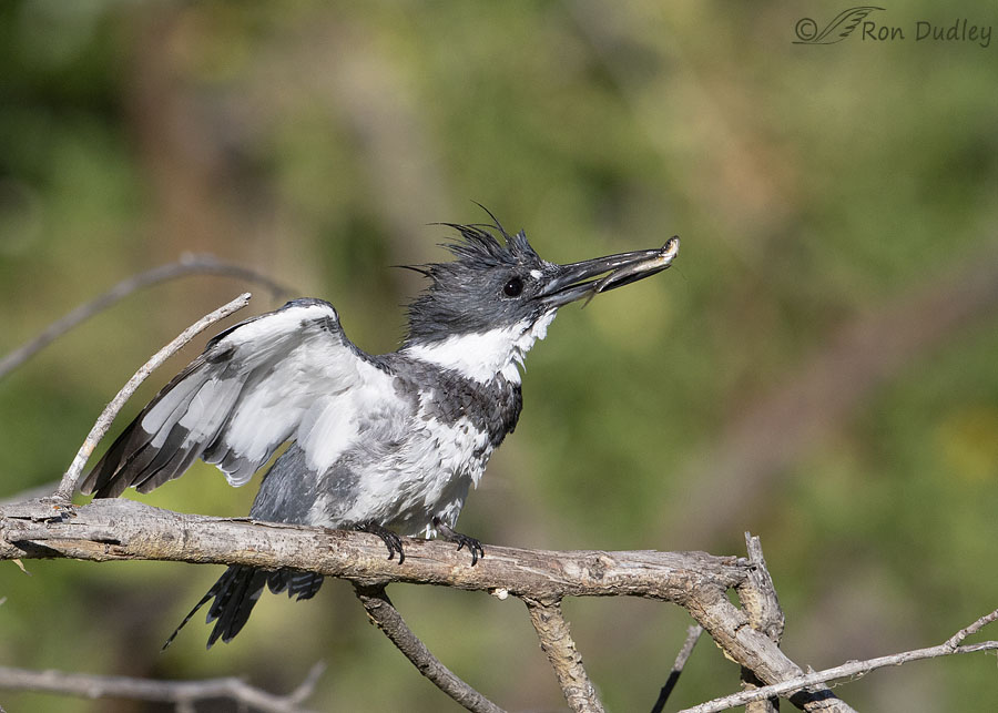 This photo was taken two days ago and the kingfisher is a mess. He’s wringing wet from a recent dive to catch the fish in his bill and he’s molting (in other photos I can see many missing wing and tail feathers). I actually laughed at him when I took the shot because once again he’s in a defensive posture in response to an attacking Barn Swallow but he couldn’t open his bill to look more menacing like he usually does in this situation because if he did he’d drop the fish. So here he’s trying to look mean but he can’t open his bill to look more aggressive to the swallow. It must have been frustrating for the kingfisher.