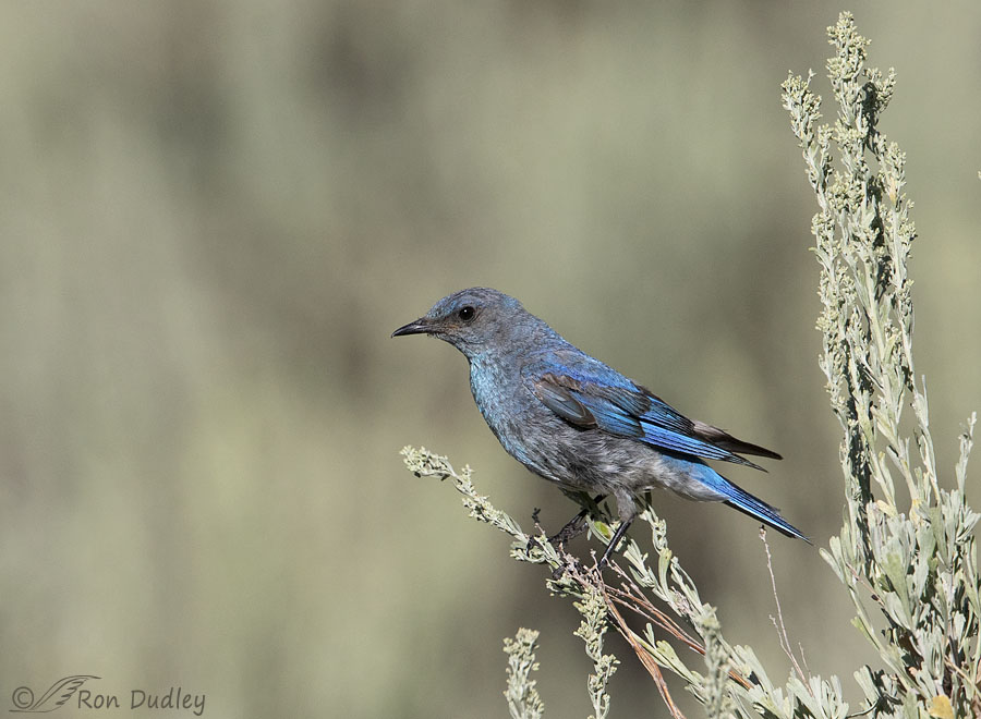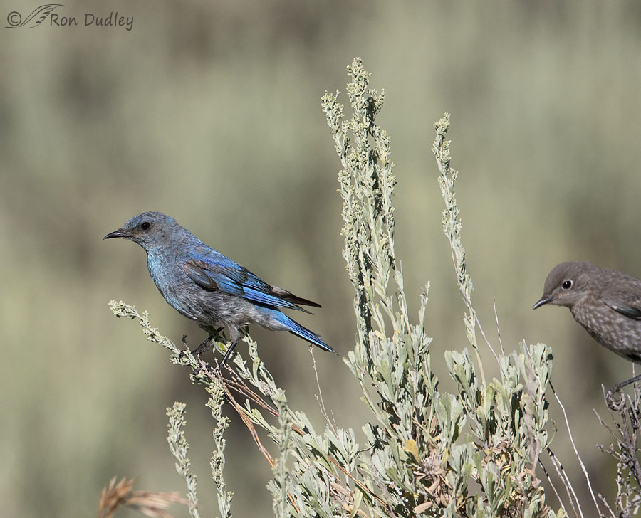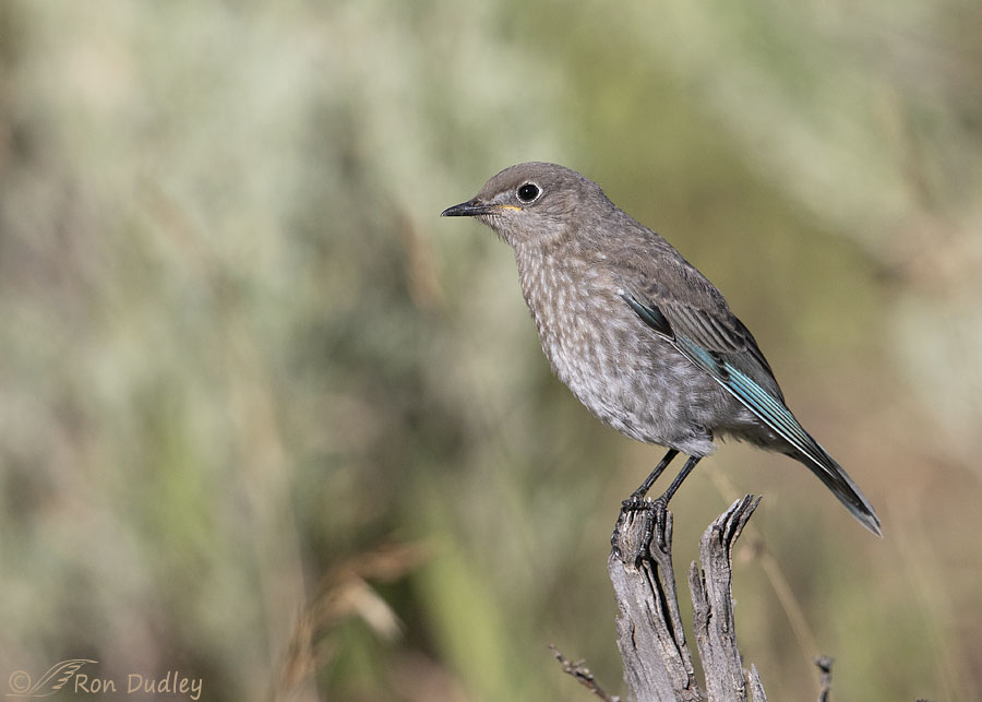 Three days ago while slowly cruising a dirt road in the mountains I encountered a male Mountain Bluebird on a far-off sagebrush (this isn’t him). I thought he was too distant for quality photos but I stopped to watch him on the chance he’d come in closer. It soon became apparent that he had 4-5 fairly recent fledglings in tow and the entire tribe was badgering him for food.