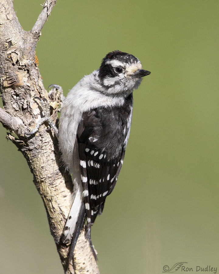A field mark I recently learned about the Downy is black bars on the outer white tailfeathers, which show up very well in the last photos on the tree.