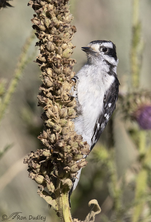 My answer to the question is that the thing that would ruin the shot is a thistle? That photo that you say might be your best Downy is really good. So far I have never seen one here although we do show them as showing up during migrations etc. We have Hairy and Ladder-backed and of course we have more Acorn Woodpeckers than I could ever count. And thanks for the info on their size – I did not know that.