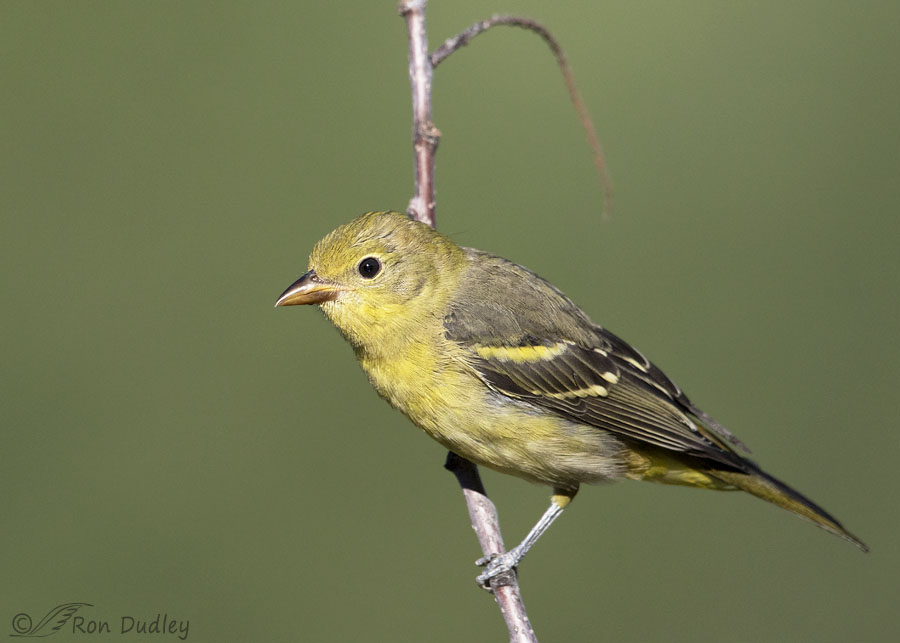 Yesterday morning just after dawn while waiting for birds to show up at one of my favorite spots in the mountains this young Western Tanager made a surprise appearance in a bush right in front of me. ‘She’ was close and in good light and she even looked my way a time or two.