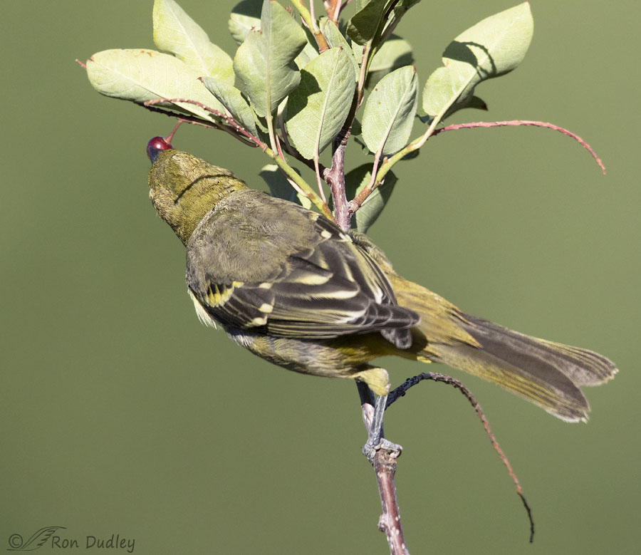 But it quickly became apparent that what attracted her to the perch was the berries just above her. She moved several inches up the branch and investigated one of them (which she never did eat).