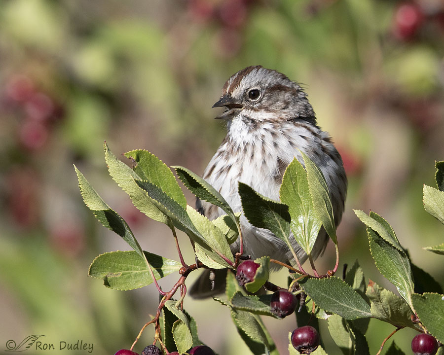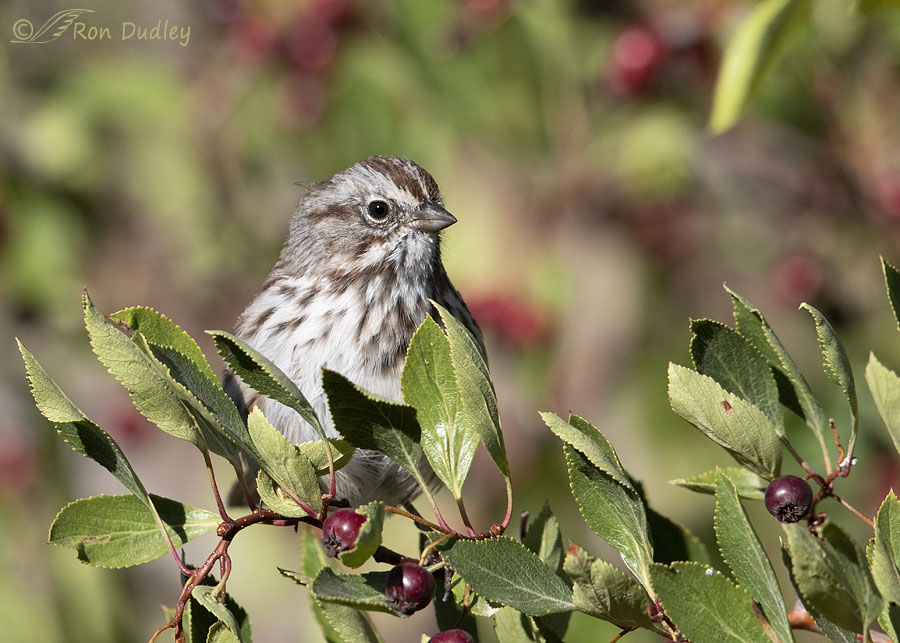 This was about the extent of his pose variety but I was pleased to photograph such a dandy looking sparrow in an attractive setting like this. The bird and the entire perch are sharp, the leaves are in their prime and attractive and I think the foreground berries add a lot, complemented by the splotches of color provided by the out of focus berries in the background.