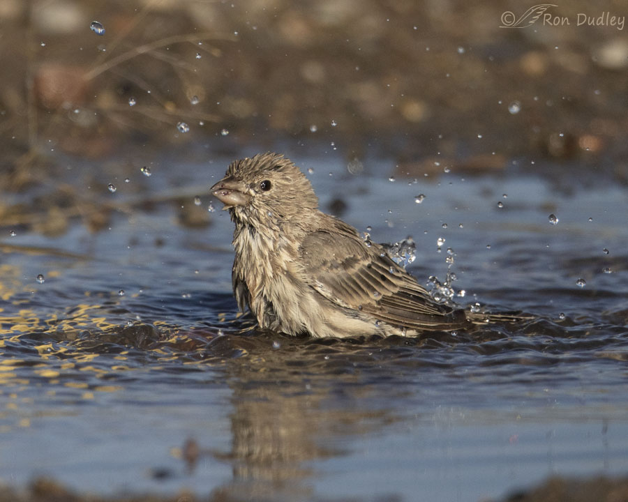 I took this photo of a bathing female House Finch very soon after I got off the mountain on my way home. Take a wild guess where I took the photo.