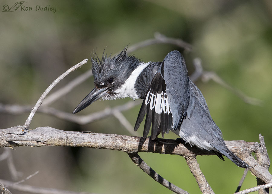 Belted kingfishers are now one of my favorites, thanks entirely to your photos. This one has a lovely mischievous quality, as they often do, and I like the shadows his wing feathers make on the branches below. 😊