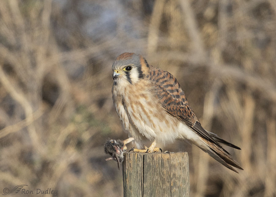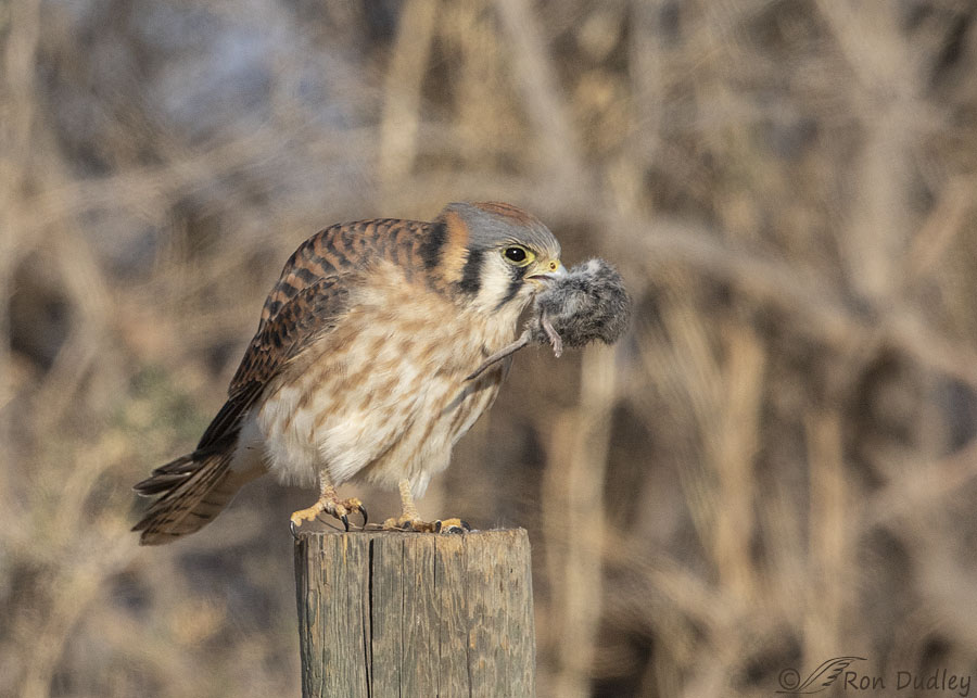 The greasewood in the background is busy and unattractive but I’ll put a kestrel with prey in my viewfinder no matter the setting.