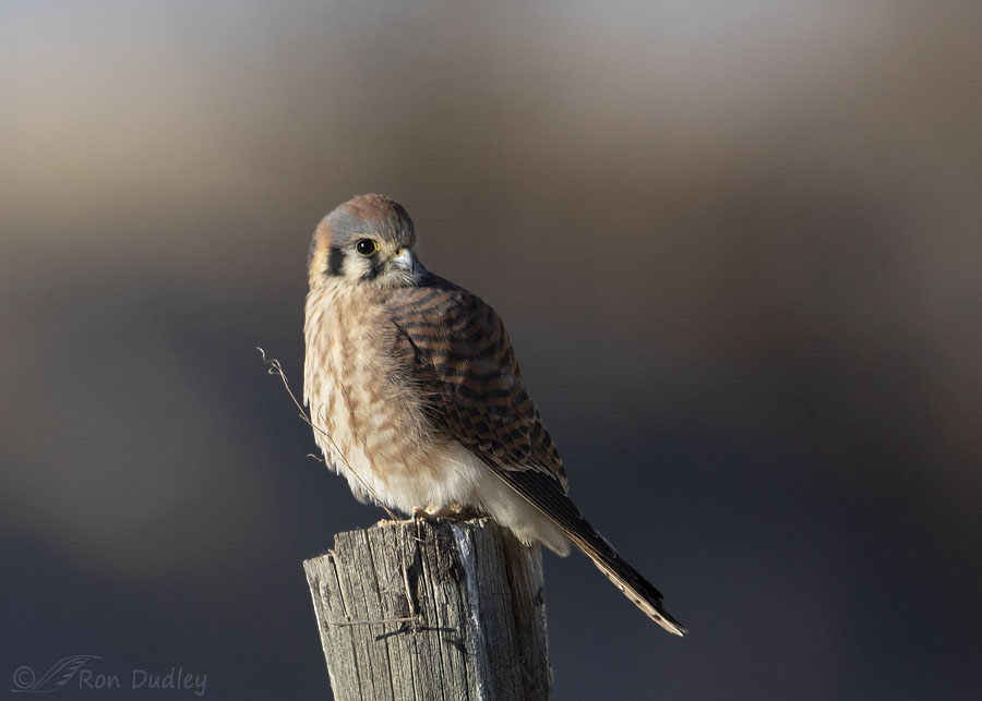 Two weeks ago I was undecided about whether I should even attempt to approach this female American Kestrel on a weathered old post because she was so strongly side lit. I knew the high contrast of the bird would be accentuated by the mostly dark background and she was unlikely to let me get close enough anyway. But imagining the shot in the mind is often a poor predictor of actual results so I decided to give it a go.