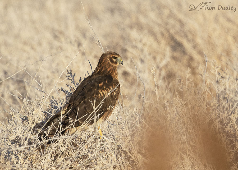 Yesterday morning when I spotted this immature Northern Harrier on the ground in good light I almost didn’t stop for ‘her’. She wasn’t particularly close, she was partially buried in the vegetation and she was facing partly away from me so even if she did take off she’d most likely only give me butt shots in flight.