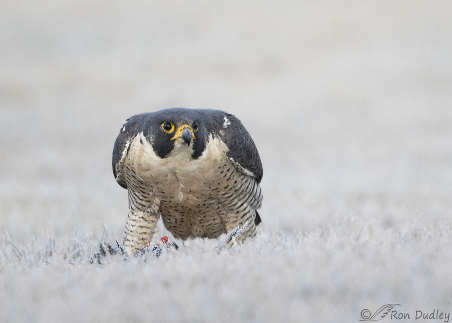 This Peregrine Falcon is even more scary than just it’s stare. It looks like it has three nares and an unnaturally wide gape. Might just be the camera angle (ground level from your truck? Neat trick.) or it’s a menacing mutant. The hoarfrost adds to the scene of carnage.