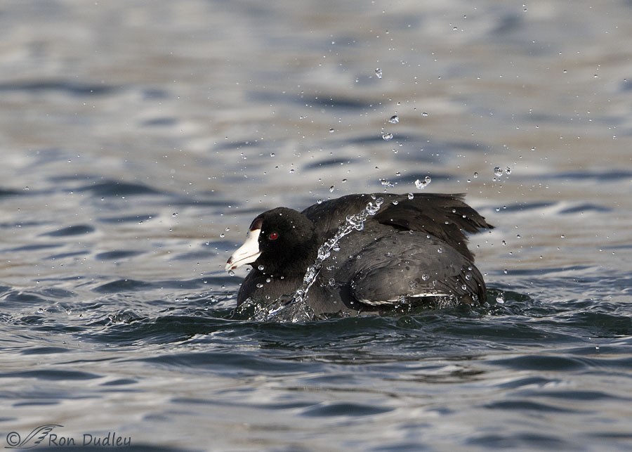 Coots are difficult photo subjects during their bath. Like other birds it’s hard to get their eyes open and visible during the frenetic activity but the deep blacks on their head and dorsal surfaces make it extra challenging to get much detail there, especially without overexposing their mostly white bill..