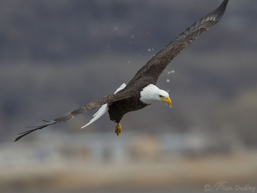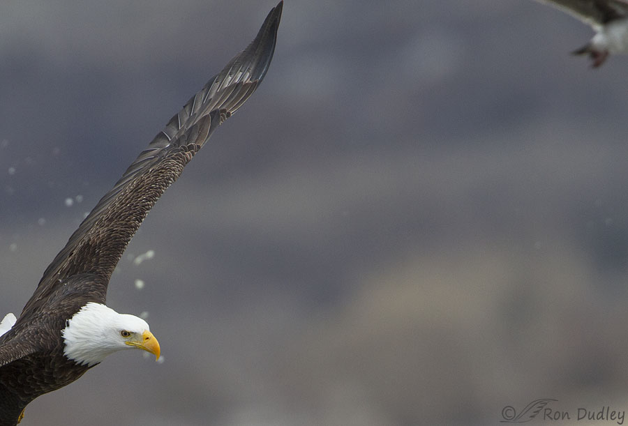 There’s a small portion of another bird in flight, likely a gull, in the upper right corner of the frame. To me it seems even less likely that the gull is the source of the spots than the eagle. I suppose it’s possible that the gull shook water off in flight and that’s what we’re seeing but I’m at least a little skeptical of that theory.