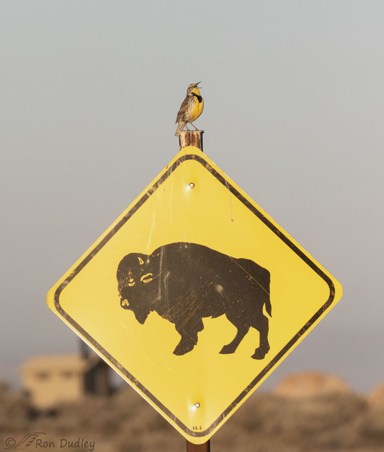 Later that same morning. I seldom post photos of birds on sign posts when the sign is this prominent but I get a kick out of bison signs on the island and to my mind they can only be enhanced by the presence of birds. Perhaps this Western Meadowlark singing on territory thought he was a bison and was celebrating his delusion..