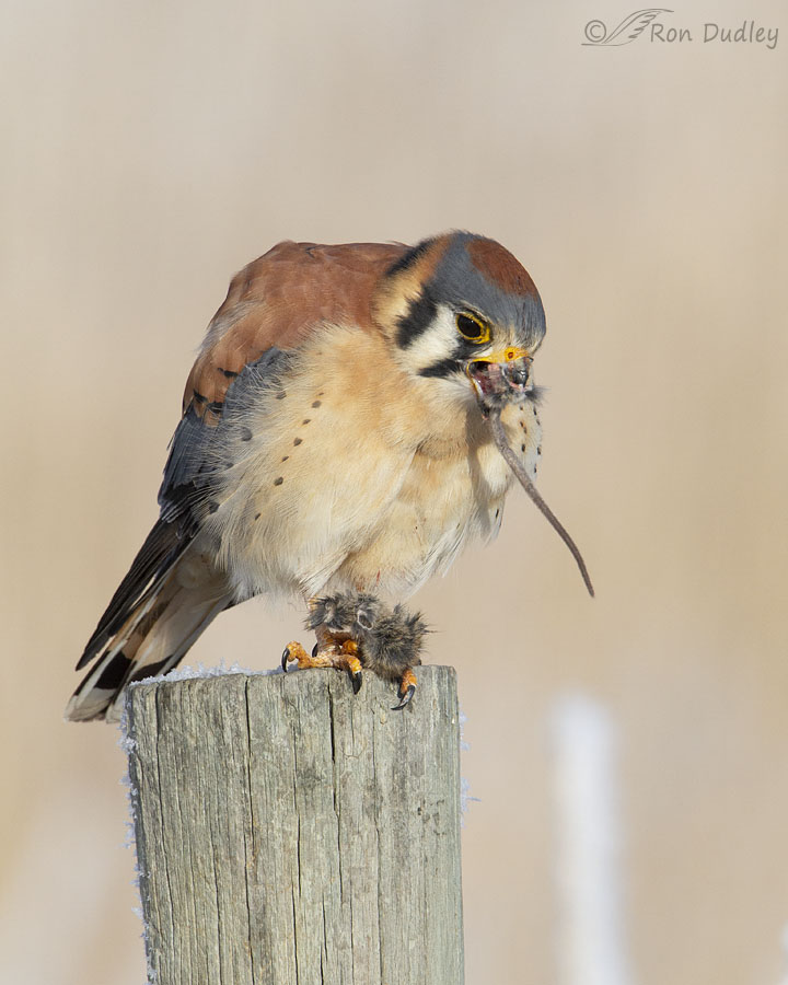 This male kestrel at Farmington Bay WMA in winter treated the mouse’s tail as dessert. There’s relatively little nutrition in the long, skinny appendage consisting mostly of skin, hair and bones but when it comes to survival, especially in winter, every little bit counts.