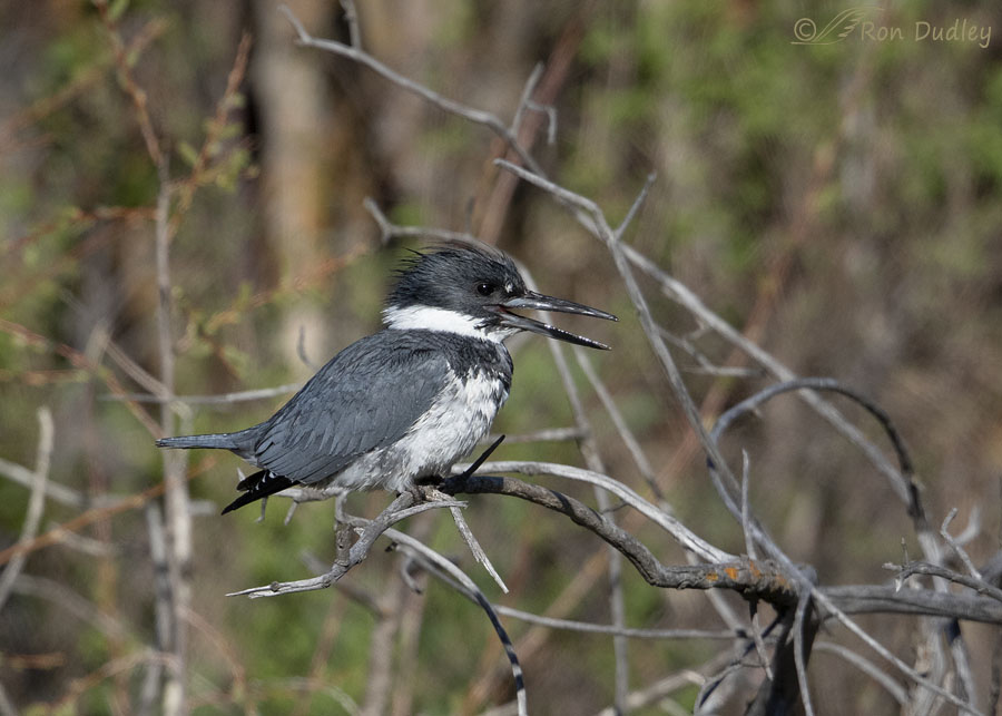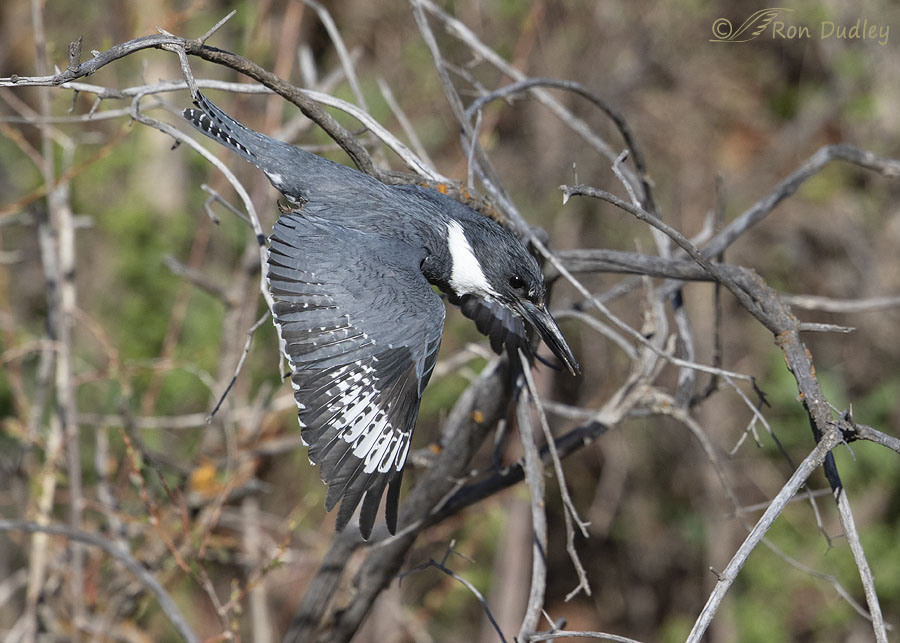 Three days ago I spent quite a while trying to photograph this male Belted Kingfisher as he was fishing in a mountain creek. While I was with him he used about a half-dozen different perches that had a clear view of the creek, some of them repeatedly. He was seldom super-close to me so I used the opportunity to try to get takeoff and flight shots, even though the settings were often cluttered with branches and twigs.
