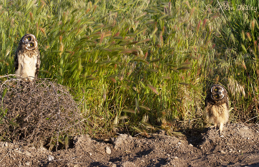 I backed off my smaller zoom lens to 164mm so I could get both youngsters in the frame for comparison. Here both owls are parallaxing my pickup, probably because of camera shutter sounds. Cute little rascals aren’t they.