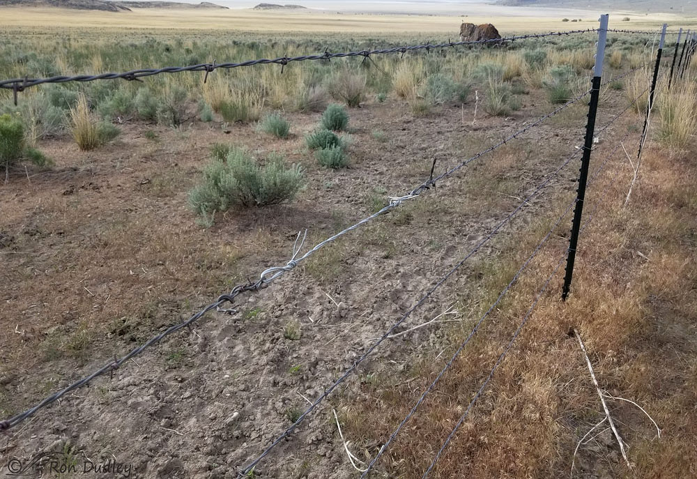 The difference in flora around the fence is striking. Weedy as heck in the first photo; more native looking sage and bunchgrass in the second. Drought related?