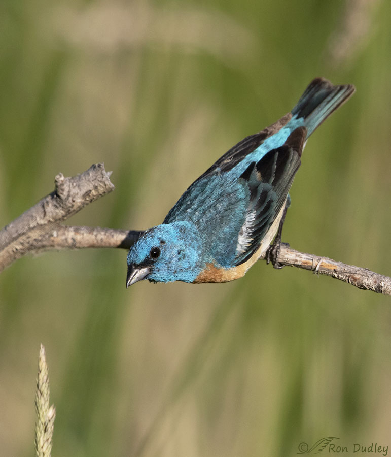 Three days ago in the mountains I caught this adult male Lazuli Bunting as he was leaning into takeoff. An instant after this photo was taken his wings were spread spectacularly but in that photo I clipped a wingtip and his face was soft. Because of his leaning and angled posture it may look like I was shooting almost straight down on him but my shooting angle wasn’t steep at all. The vertical grass seed head at lower left provides some perspective on my actual shooting angle.