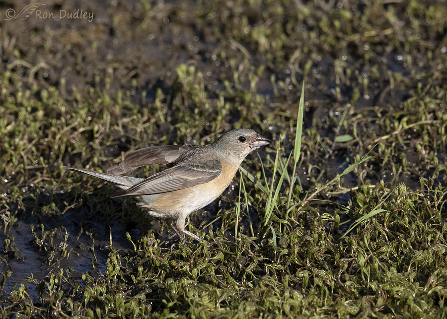 A female Lazuli Bunting exploring the emergent vegetation coming out of the mud next to a stream.