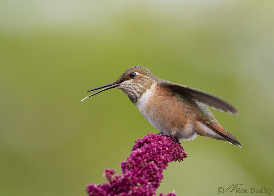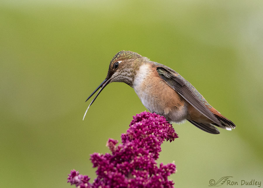 It was our old friend the feisty young Rufous Hummingbird who had just landed on his favorite amaranth perch in my garden. Soon after he landed he began to repeatedly stick his tongue out, a very common practice among hummingbirds. Common or not I like to photograph their unique tongues so I fired off a quick burst, expecting to capture nothing more than his tongue action.