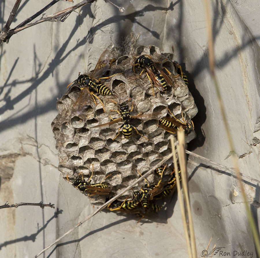 A nest full of wasps on the side of a large rock that gave me something to photograph while I was waiting for nuthatches and chickadees to show up at a Douglas Fir in the mountains. The anticipated birds never made an appearance.