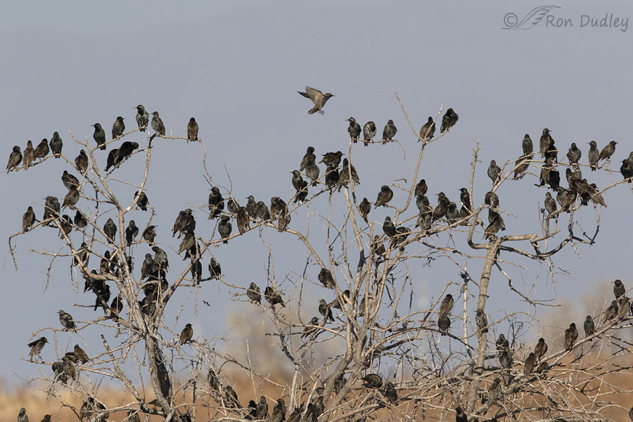 European Starlings were out in force and even though I rarely aim my l lens their way this large flock weighing down a small tree was pretty impressive. Because of their black color and the time of year it reminded me of a Christmas tree in mourning.
