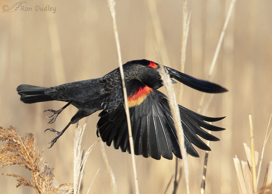 Because of their photon-sucking deep black color, Red-winged Blackbirds are hard enough to photograph well when they’re perched. So to get a flight posture like this with his red and yellow epaulet displayed so well, excellent detail in the blacks of his entire body and to get him sharp without cutting off any body parts is an accomplishment.
