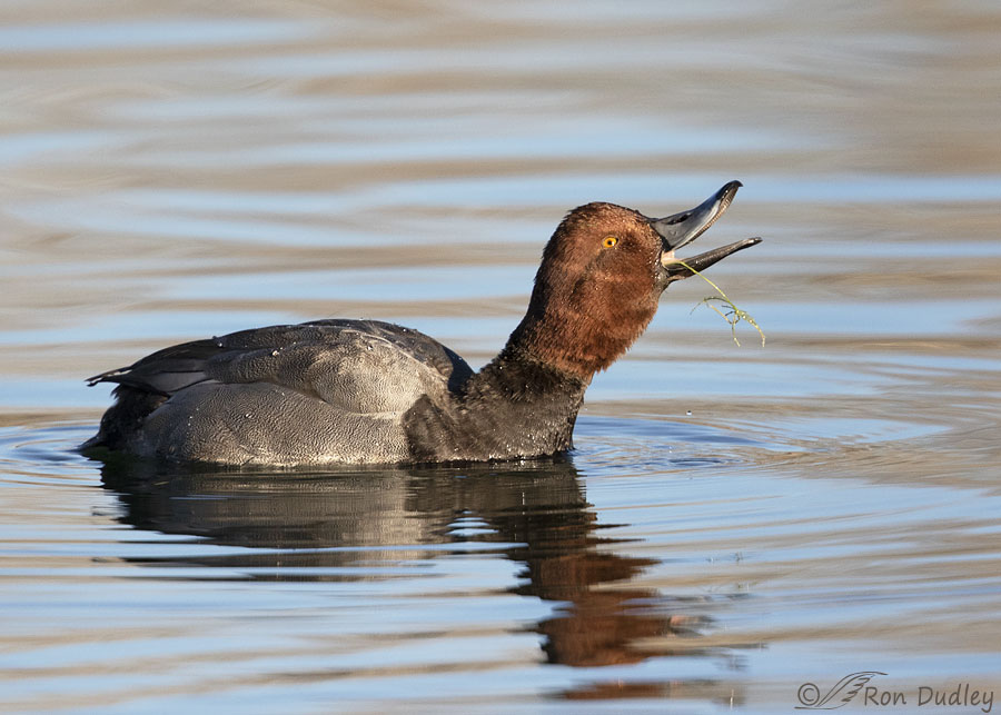 Male Redheads ARE beautiful. 🙂 Perhaps the one seeming to have trouble swallowing just had one little piece that wasn’t wanting to go – been there, done that. 😉 Love the dives even if the eye wasn’t showing and the shots certainly are consistent indicating your reflexes – a bit frustrating, I’m sure BUT! Appears their bills to turn up a bit – perhaps that makes it easier to flex it up? Interesting the coot seems to know it’s limits as to what it is going to attack – good news for the Redheads! 😉