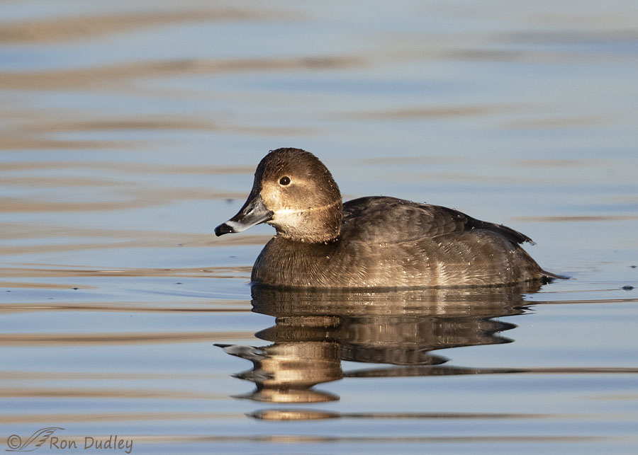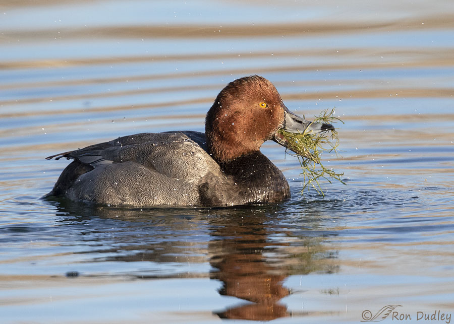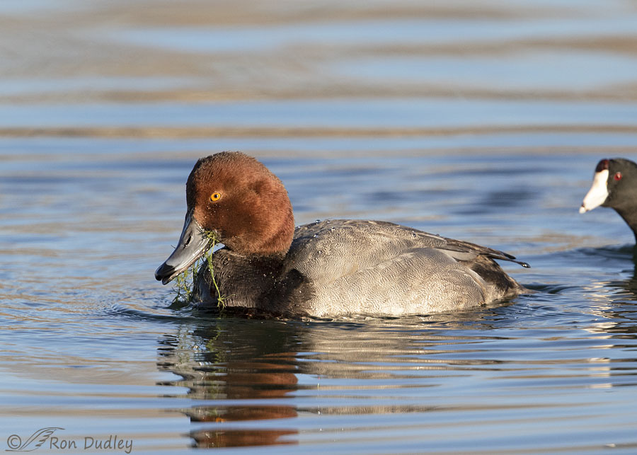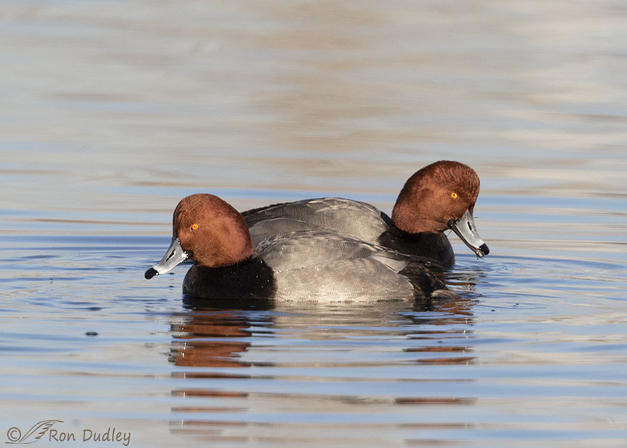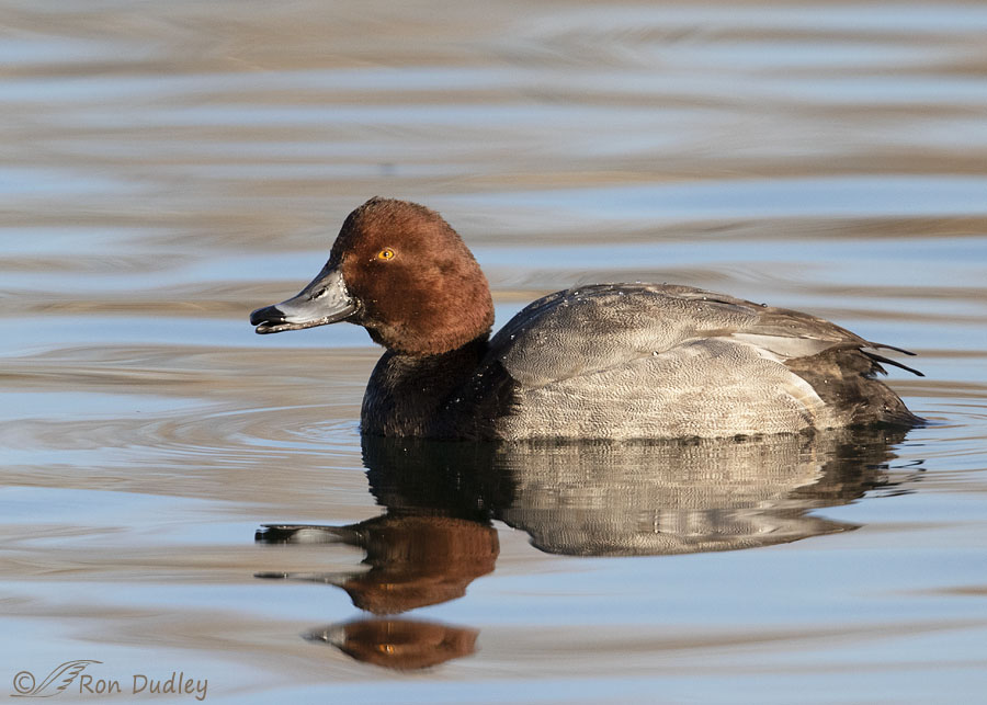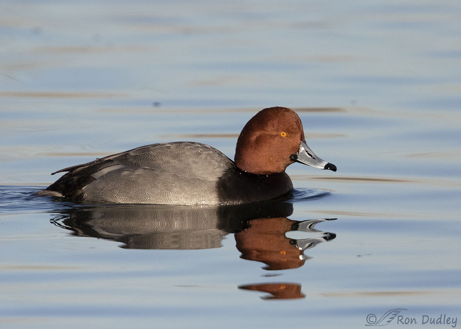 With their gleaming cinnamon head setting off a body marked in black and business gray I think drake Redheads are unusually handsome ducks. This guy was looking particularly dapper in the morning light, despite the cockeyed reflection of his head and bill that seemed to throw some confusion into the mix about what he actually looked like.