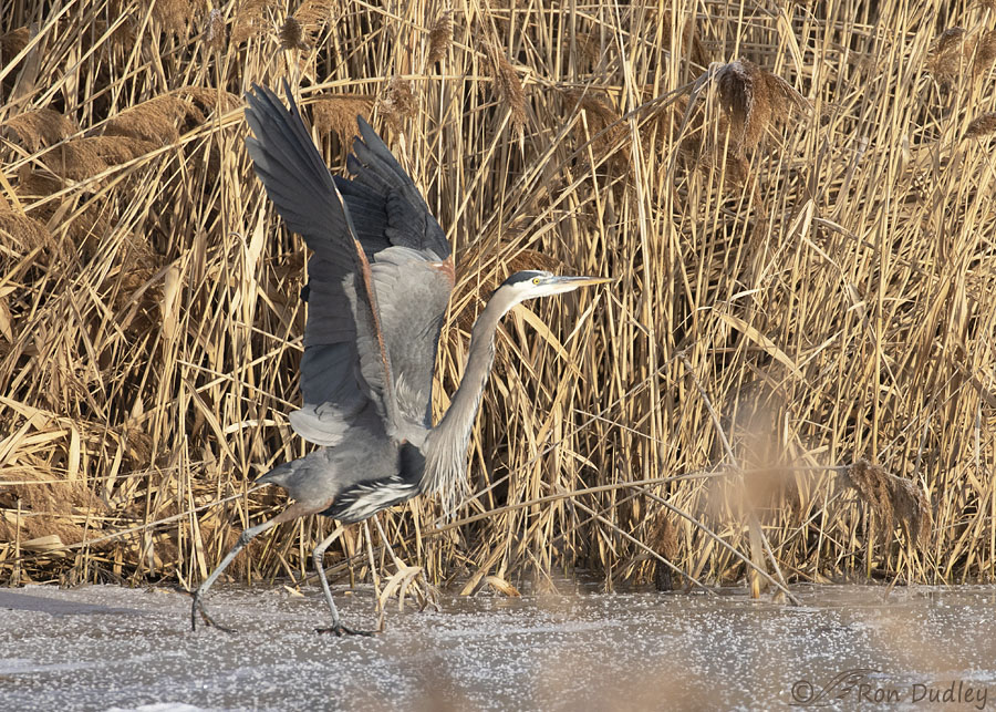 That’s exactly what happened with this Great Blue Heron three days ago at Bear River MBR. I had to creep forward to have a clear view of ‘him’ through obstructing vegetation, some of which can be seen as out of focus blobs at lower right. By then, while using my 500mm prime lens, I knew I was too close to keep him comfortably in frame when he lifted his wings to take off.