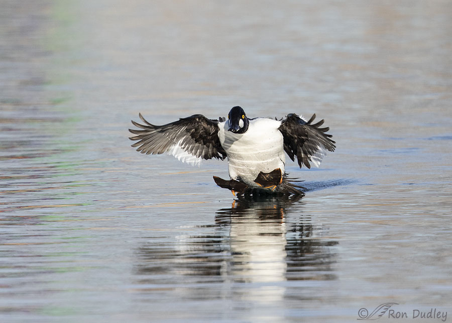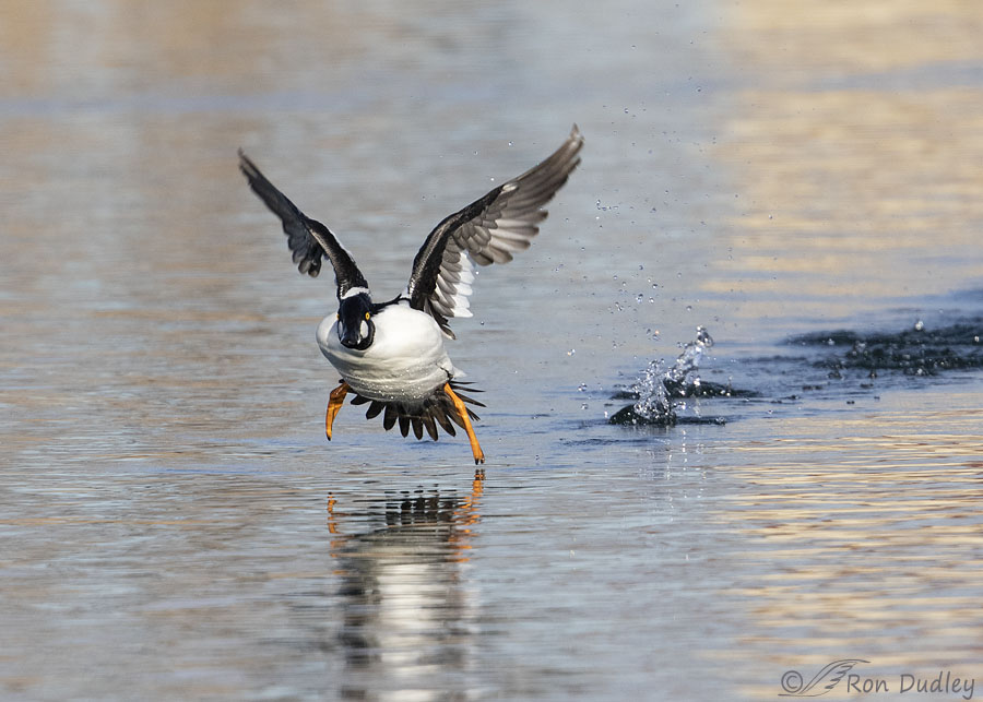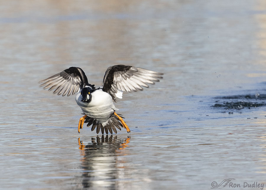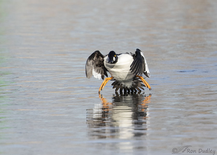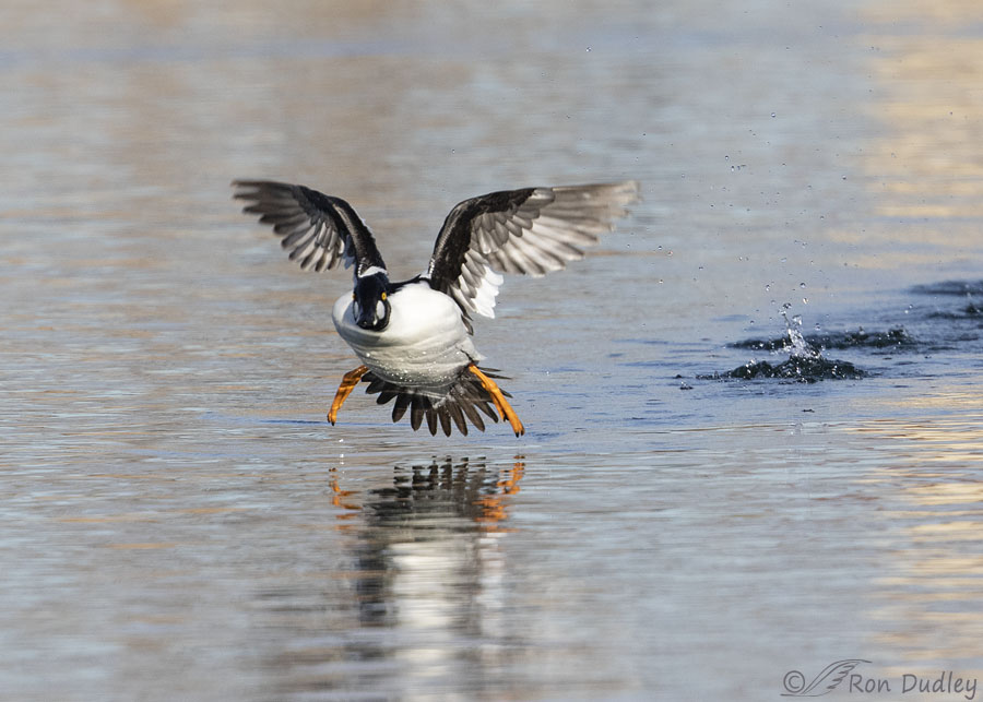 Another fun photo series, Ron! I love this little Goldeneye especially when he is coming in for a landing with his webbed feed spread so he can ski to a soft stop. Having watched waterfowl paddle with purpose, I personally think that it is easier for them to fly from point to point. Water density offers so much resistance that lifting one’s wings and flying over the water seems easier and quicker. When I watch my little domestic mallard with her 2 wild mallard beaus I feel sorry that she is unable to fly more than 3 feet while they effortlessly take off leaving her to plow through the water. She truly struggles to catch up. The R5 sounds like quite an investment. I would be overwhelmed by the new technology which is probably child’s play for you. Can’t wait to hear your decision.