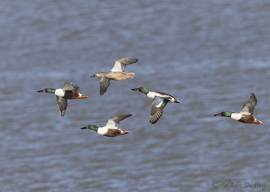 There was actually a fifth Shoveler trailing behind, as revealed by a different crop of the same image. I like both versions of the photo.