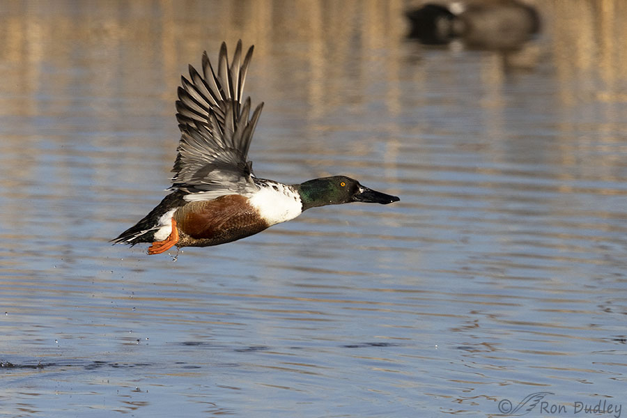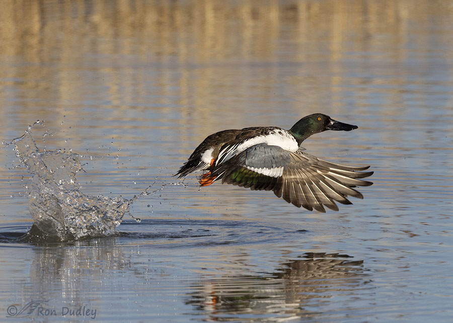 When photographing ducks taking off it helps to know if they’re puddle ducks or diving ducks because that little bit of knowledge makes it easier to keep them in the frame. Diving ducks have to run horizontally across the water to build up speed to take off but puddle ducks spring directly into the air instead of pattering across the water. So with puddle ducks like Northern Shovelers it’s easy to not leave enough room for them at the top of the frame as they gain elevation.