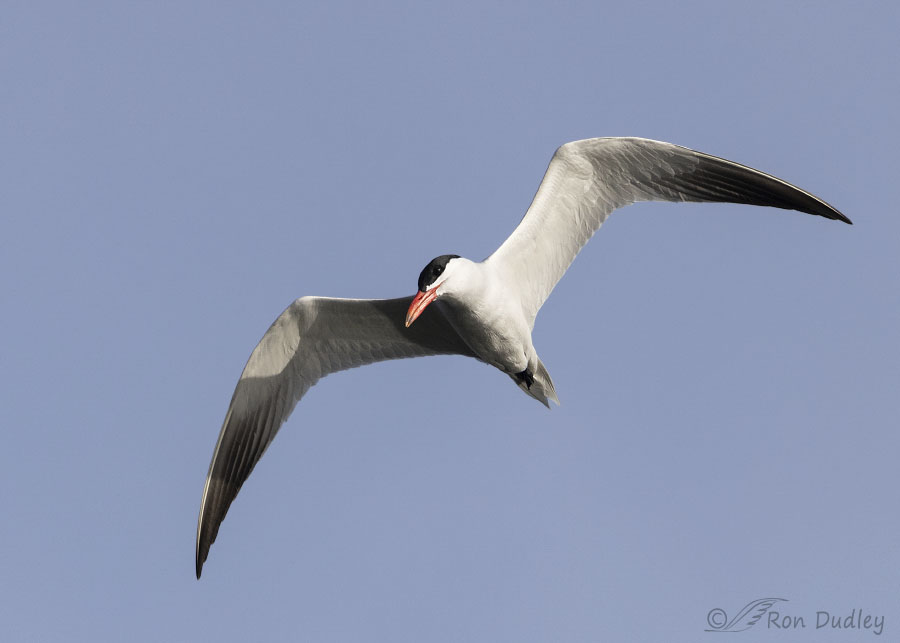 On several recent mornings I’ve tried to photograph Caspian Terns in flight but until yesterday I’ve always been stymied by circumstance. As they fished they always made counterclockwise rotations around the pond and by the time they got close enough to me they were in sidelight with their face in shade. That unfortunate fishing flight pattern never failed.