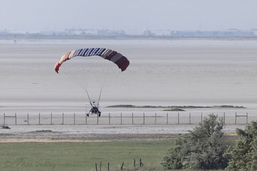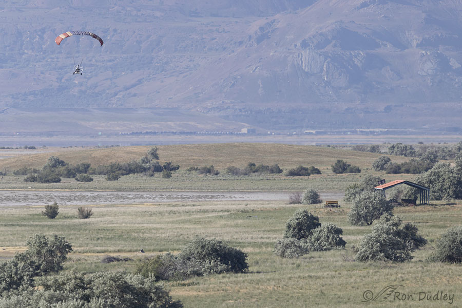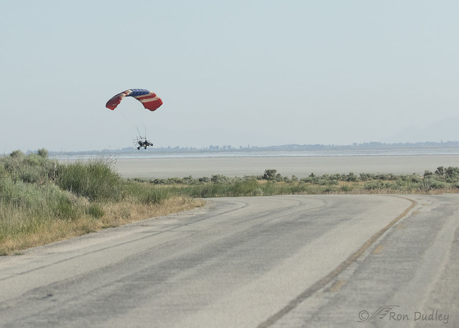 Because the pilot was hanging down from the parachute, I could see part of his contraption before he could see my pickup. But the instant he saw me he turned sharply to his left and headed east toward the nearby shoreline of what used to be part of the Great Salt Lake. This photo was taken through my dirty windshield with my smaller zoom lens just as he was turning to head east. And then he turned south again and followed the old shoreline toward Garr Ranch.