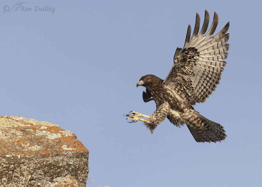This is almost certainly the same unusually dark, immature Red-tailed Hawk I posted photos of two weeks ago. ‘He’s’ still young enough that yesterday morning he was practicing his landings by repeatedly taking off and landing on rocky perches that were close to each other, which provided me some much-needed practice too. This is one of my favorite shots from our shared practice session.