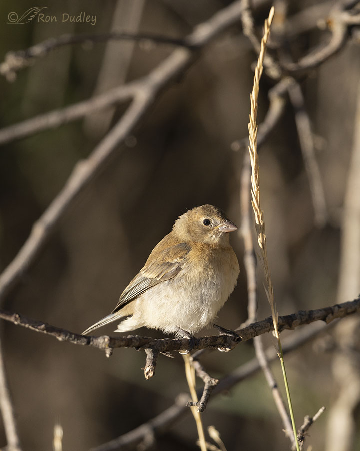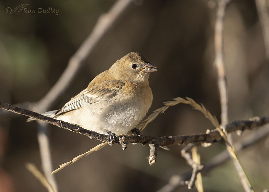 Early yesterday morning in the Wasatch Mountains this female Lazuli Bunting gave me fits as she was foraging for food near the bases of several nearby bushes. Each time she stopped in one place for more than a second or two there was at least one tiny twig or grass stem in front of her or annoying shadows were cast across her body.