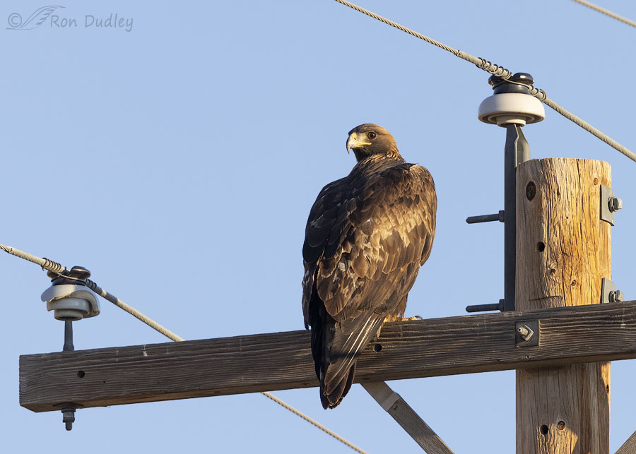 Soon after sunrise I found this side lit Golden Eagle on a power pole next to the deserted road. In past years I rarely stopped for Golden Eagles on utility poles because those types of photos do little for me. But these days a Golden Eagle encounter is so unusual I stopped to take a few documentary photos and then went on my way to my destination. The eagle was still on the pole when I left.