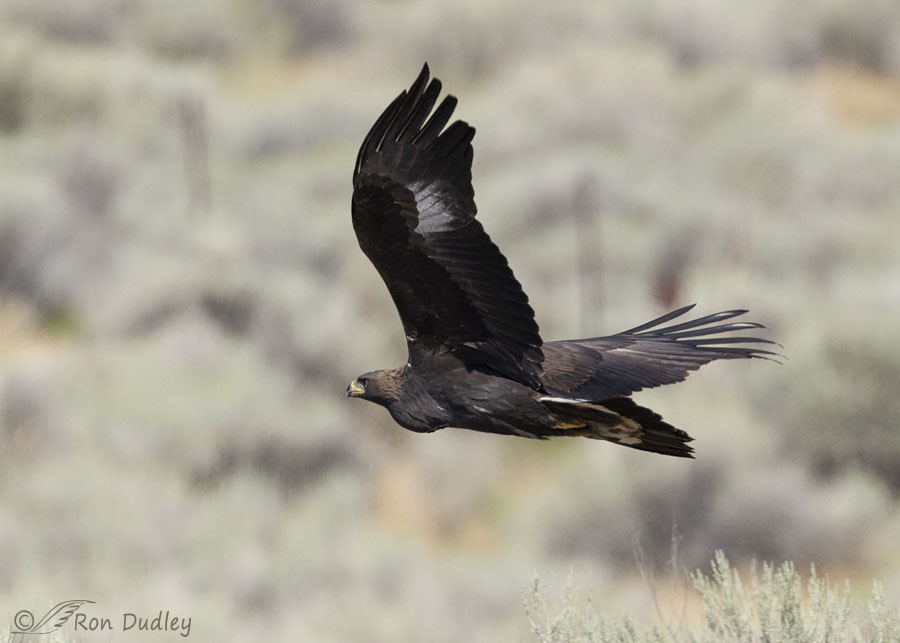Then, on my return trip 2 1/2 hours later, two juvenile Golden Eagles took off from clumps of sagebrush within a couple of hundred yards of where I’d found the eagle on the power pole earlier that morning. One of them, this one, circled low over the sagebrush twice before they both landed in separate areas on the hillside to the west about a quarter mile away. This is the best photo I managed to get of the eagle that was circling low.
