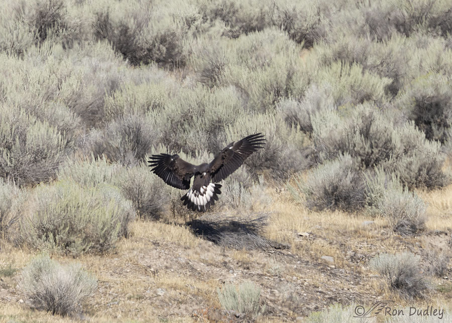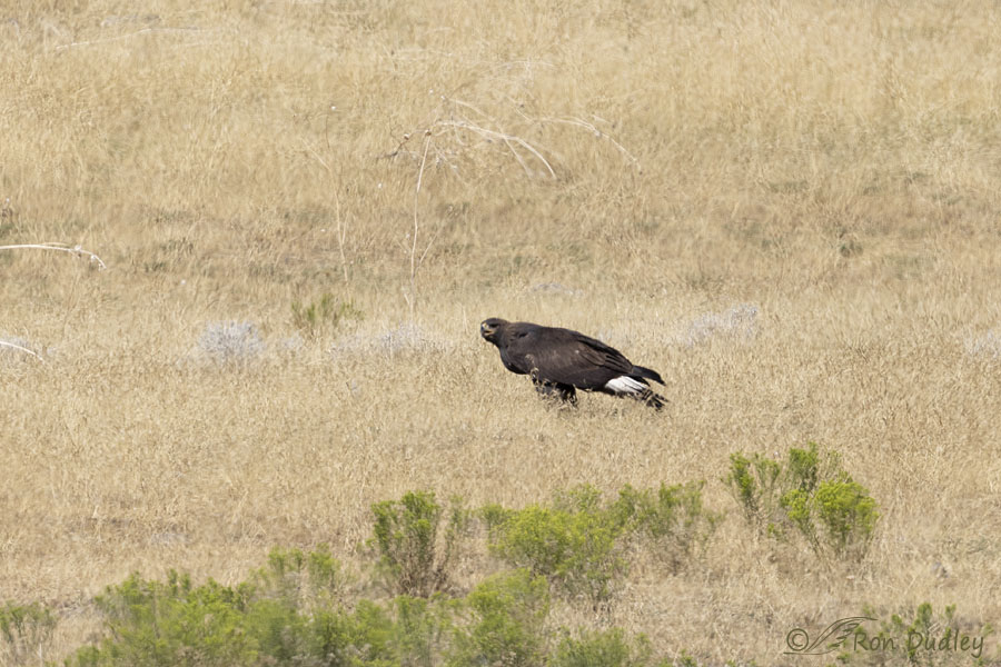 When the other young eagle landed far away on the same hillside, the prominent and extensive white at the base of the tail of juvenile Golden Eagles was clearly revealed.