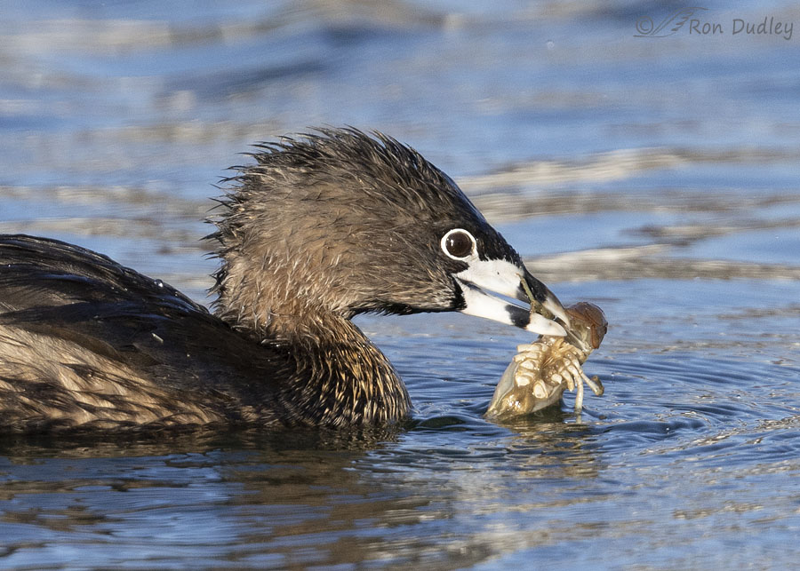 In my experience most birds that prey on crayfish swallow them whole but Pied-billed Grebes are an exception. Crayfish have 4 pairs of walking legs (the two anterior pair have small terminal pincers) and I pair of anterior appendages that have large terminal pincers (chelipeds) and all ten appendages stick out from the body. These grebes are just the right (wrong) size relative to the size of the crayfish to make swallowing them whole next to impossible when the appendages are still attached.