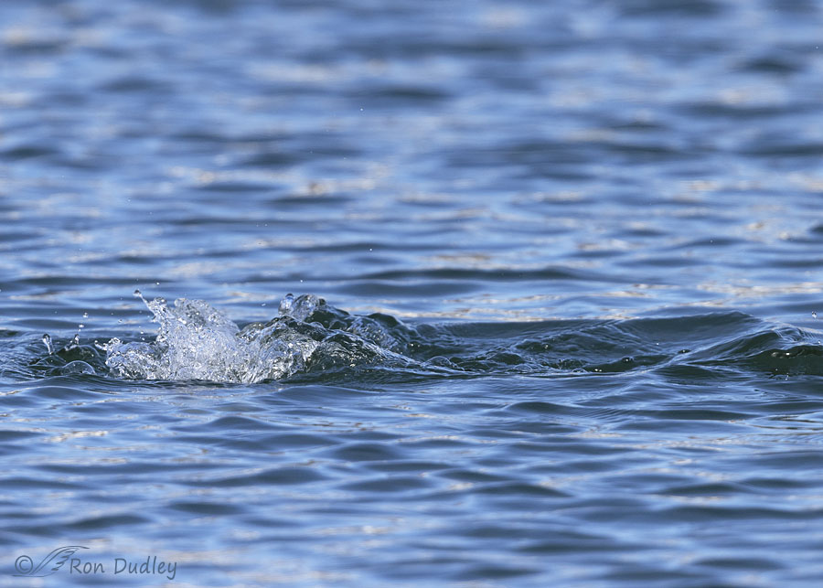 Now he’s gone. Even though there’s no portion of a bird to be seen in a shot like this I’m weird enough to like seeing the water splash where he disappeared and the depression in the water where his body had been just prior to the dive.