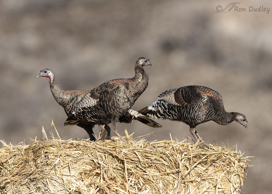 She wanted to join her friends at the top of a pile of straw bales that was right in front of her. In this group I don’t know which turkey is her but she’s one of them.