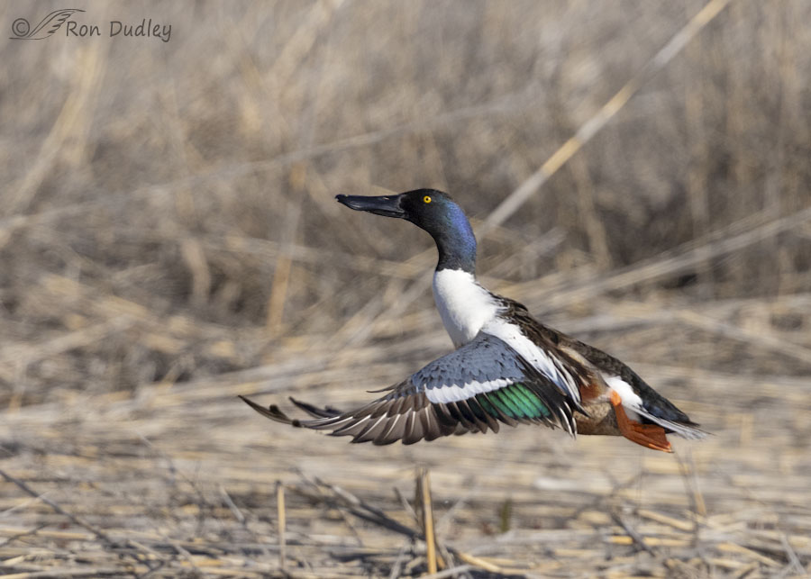 I don’t think shovelers are usually quite as quick at taking off as Cinnamon Teals but they’re close. This drake was taking off from land rather than water. Since his feet were pushing down against a solid surface it probably increased the speed of his takeoff so I was lucky to get him on the first downbeat of his wings.