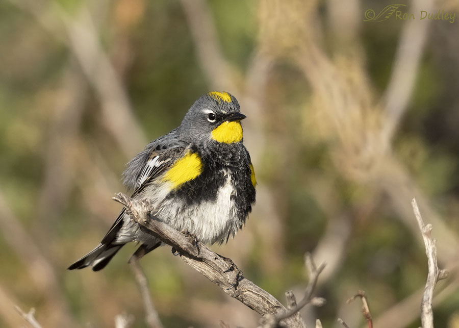 Earlier that morning I found this male Yellow-rumped Warbler (aka butterbutt) grooming on an isolated branch in a thicket of twigs and emerging leaves that were at least far enough behind him to be rendered into a soft bokeh by my lens. He wasn’t very close to me but my shots of him were sharp so they stood up reasonably well to substantial cropping.
