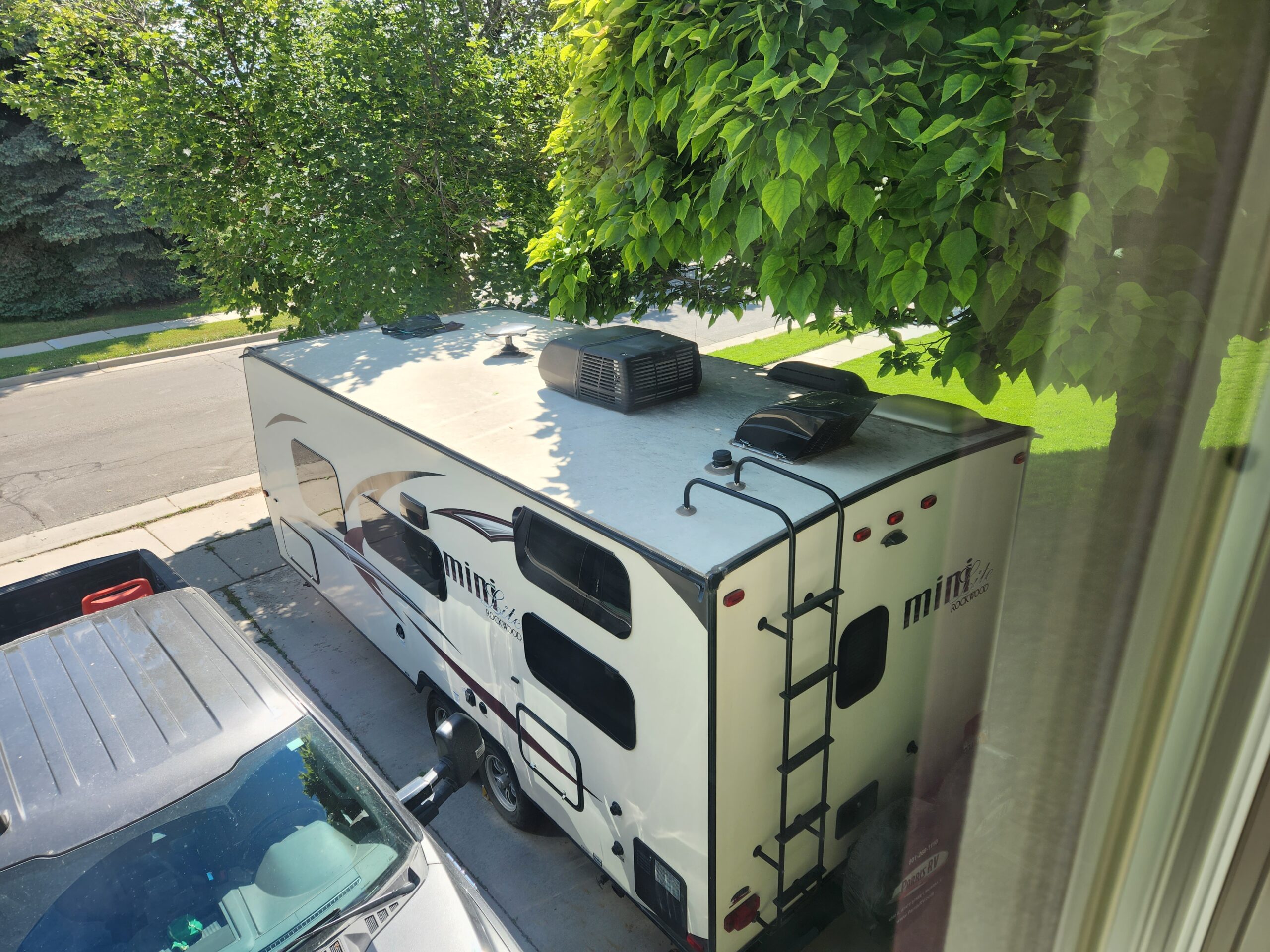 This photo, taken from one of my bedroom windows, shows that I now have plenty of room beneath the trees to park my trailer safely. The vent cap on the front of the roof is now covered with (heavier) plastic again. I have an appointment tomorrow with my trailer dealer to have a new vent cap installed.