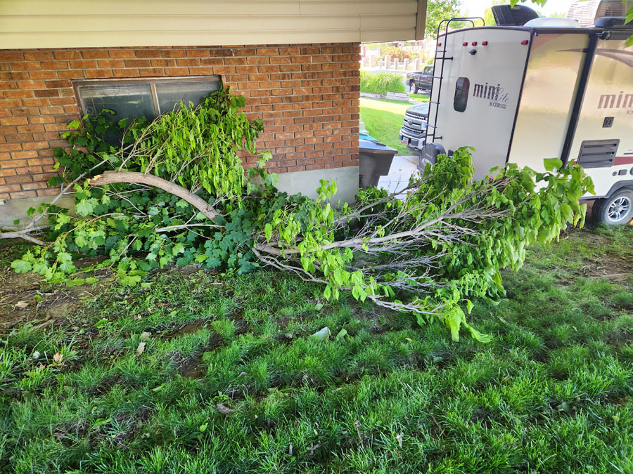 But I managed to do both. Here my trailer’s back on the driveway and these are the catalpa and elm branches I had to remove to get it there without doing any more damage. I’ve got my work cut out for me to get this mess cleaned up.