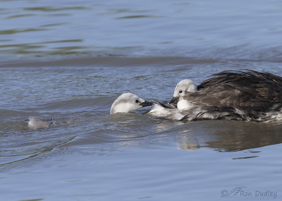 Here’s a closer look at them both, just prior to the chick in the water climbing up on the left side of his dad’s back.
