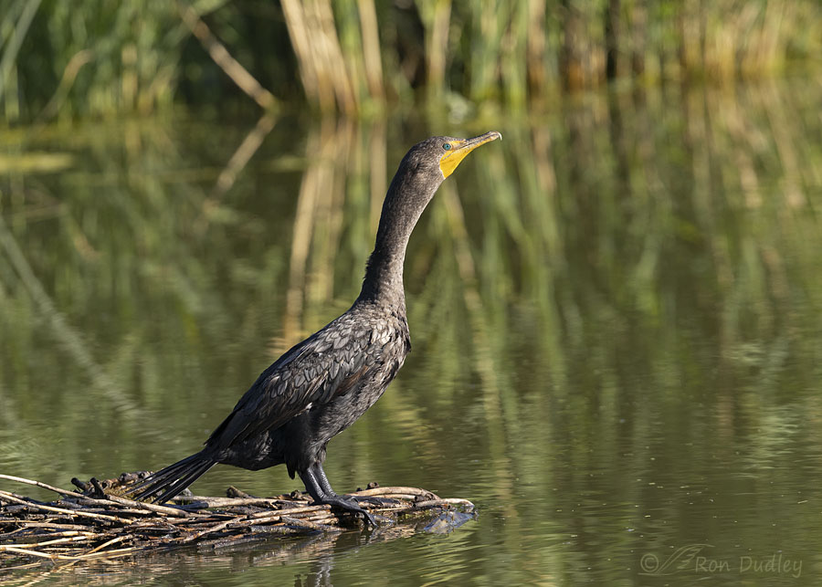 A young Double-crested Cormorant on a floating mat of dead phrag stems.