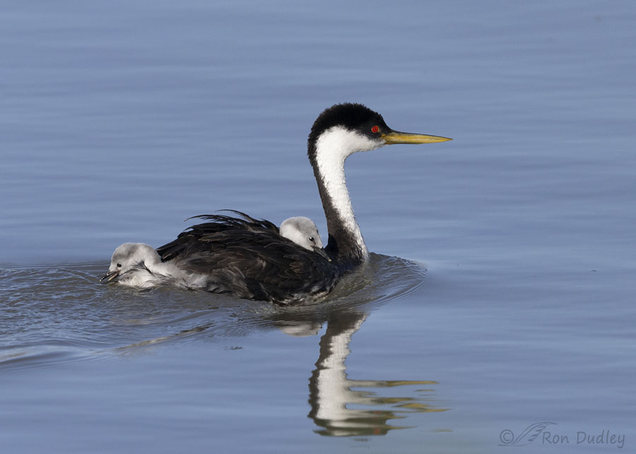 Most of a family of Western Grebes. Here Tail-end Charlie is getting a drink while his sibling seems fascinated by the bow wave Dad is making.